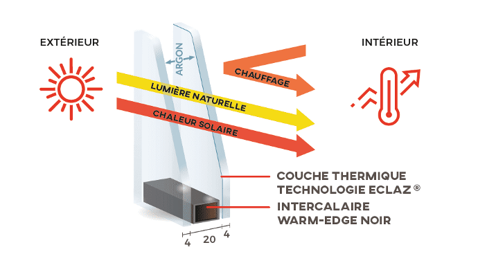 Chez Arcades et Baies, nous vous proposons en standard, le vitrage Eclaz + le warm Edge + gaz Argon en PVC et en ALU.